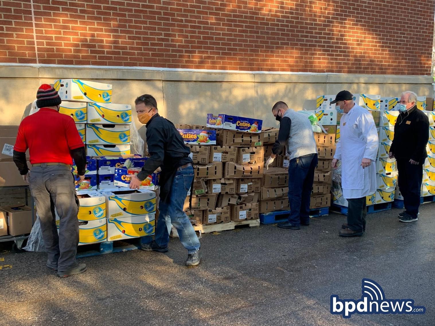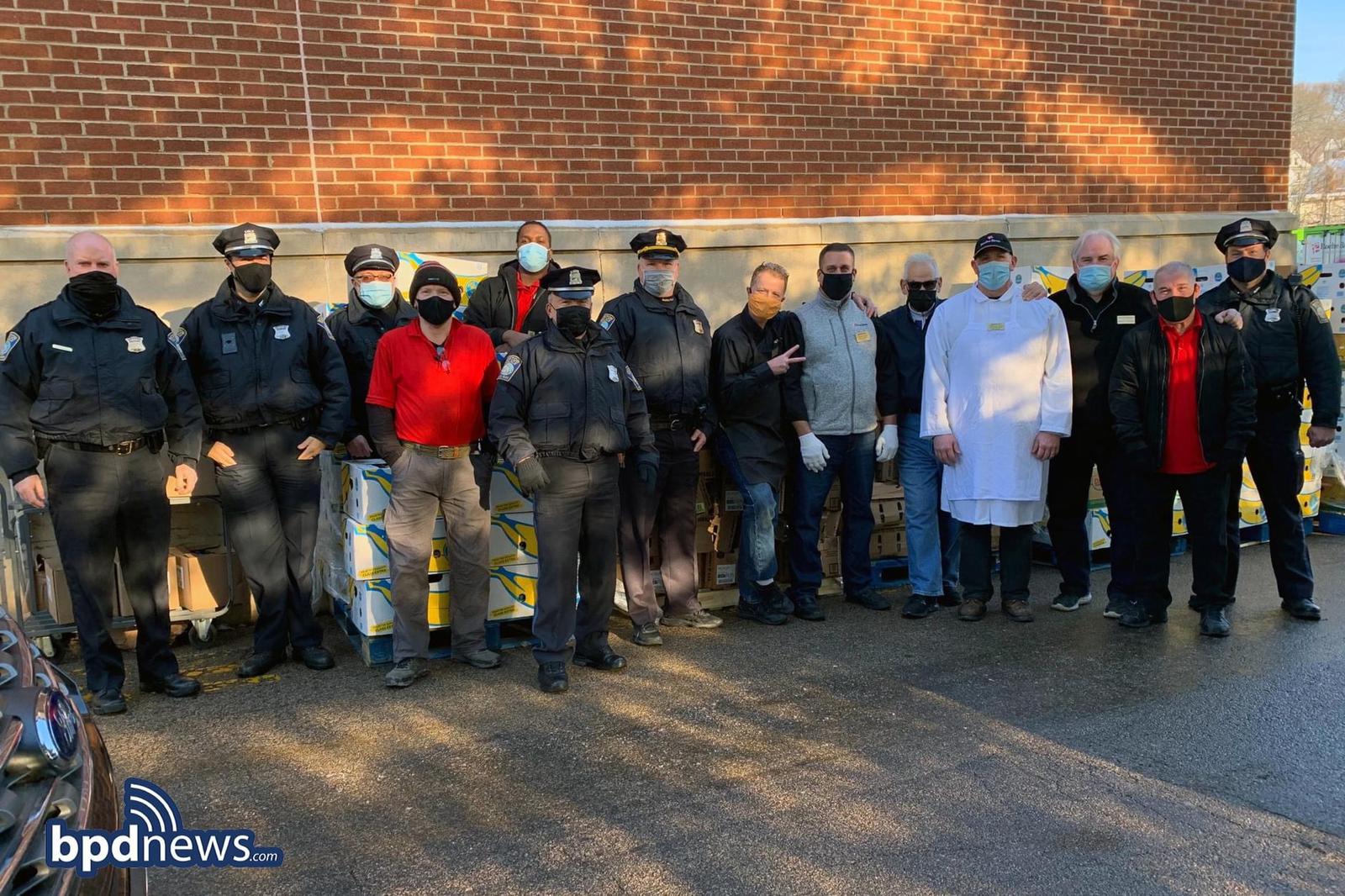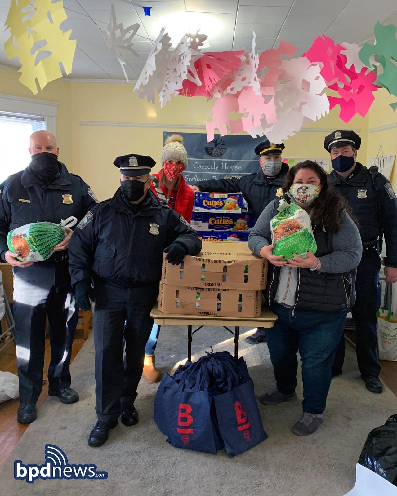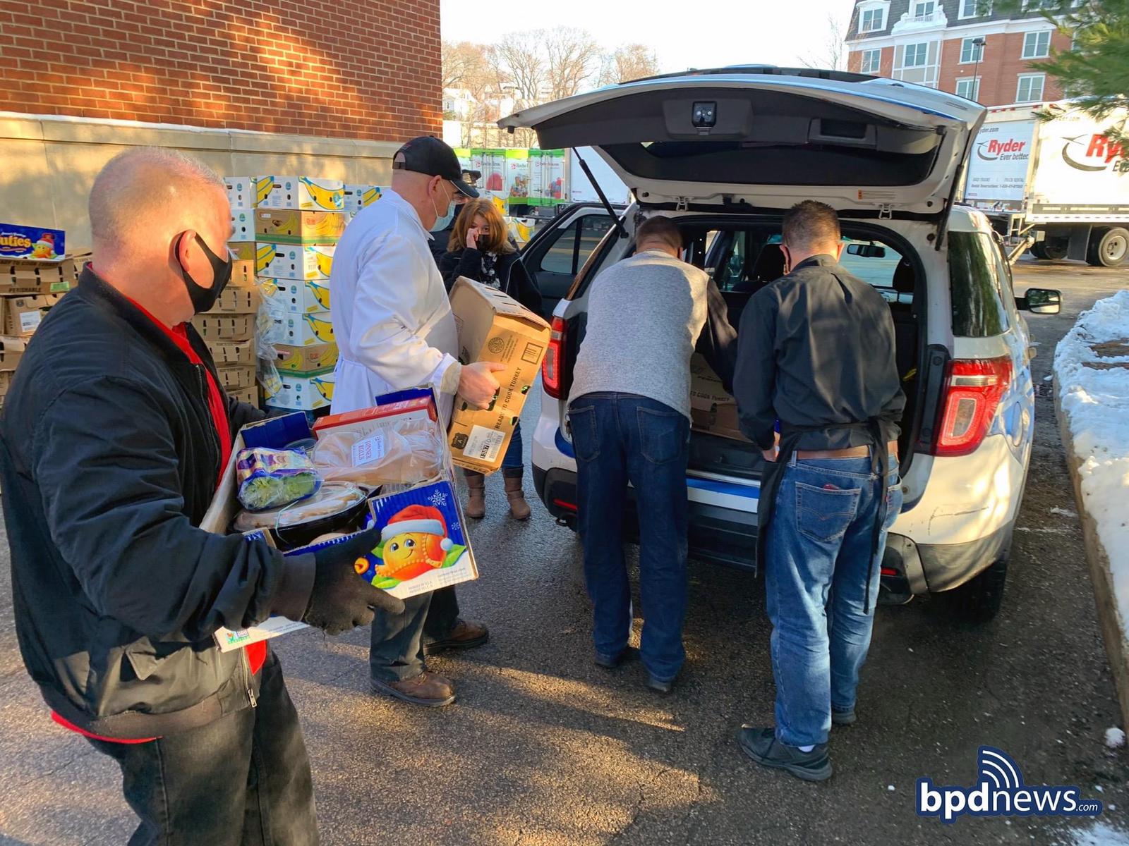 Organizado pela Associação Profissional e Empresarial de West Roxbury, os oficiais embalaram seus veículos com refeições de Natal fornecidas pelo supermercado Roche Brothers e foram entregues a famílias necessitadas em todos os bairros de West Roxbury e Roslindale.