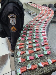 O outro também foi detido e após buscas por sua residência, os PMs apreenderam 164 pinos de cocaína; 71 munições intactas e deflagradas de calibres 45, 357, 32, 380, 762, 22, 38, 44 e 5.5, além de balança de precisão e celular. 20/10/2022 18:23 Traficantes de Itaperuna usam foto de Lula nas embalagens de drogas.