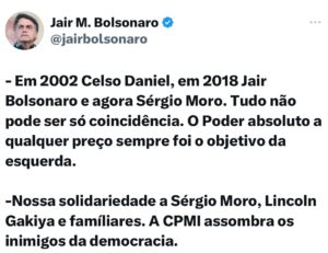 Em pronunciamento nas redes sociais, Jair Messias Bolsonaro declarou que essa tentativa de assassinato não é um caso isolado, visto que em 2002 Celso Daniel sofreu atentado e em 2018 o próprio Bolsonaro teria sido vítima de tentativa de homicídio. Completando sua fala, Jair Bolsonaro prestou leal sinceridade e se mostrou assombrado com tamanha falta de respeito a democracia.