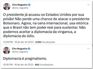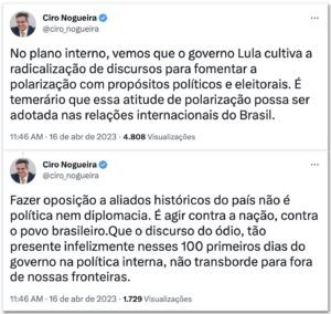 O ex-ministro da Casa Civil do governo Jair Bolsonaro, Ciro Nogueira (PI) também usou as redes sociais neste domingo (16) e criticou posicionamentos do presidente Luiz Inácio Lula da Silva (PT) sobre relações internacionais e países aliados. Afirmou que o chefe do Executivo faz diplomacia de “vingança e ódio” e “usa retórica que o Brasil não tem poder real para sustentar”
