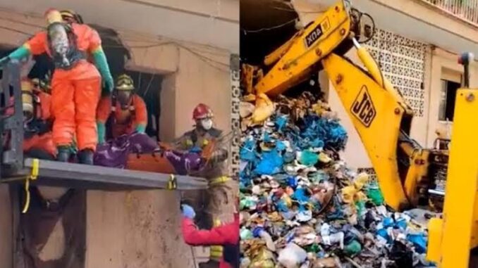 Na quarta-feira, os bombeiros realizaram o resgate de um homem de 48 anos, com mais de 250 quilos, que estava preso entre o lixo em um prédio em El Prat de Llobregat, na província de Barcelona, Espanha.