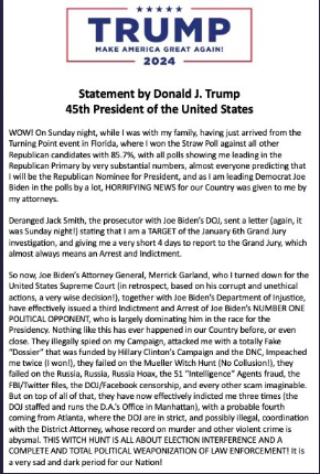 O ex-presidente, que está concorrendo à indicação presidencial republicana de 2024, segundo alegações dele, a investigação tem motivação política, disse que o procurador-geral Merrick Garland e o Departamento de Justiça “emitiram efetivamente uma terceira acusação e prisão do OPONENTE POLÍTICO NÚMERO UM de Joe Biden. ”