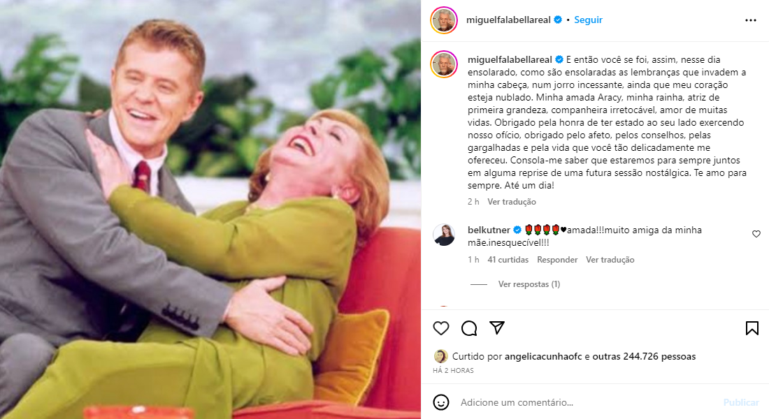 Miguel Falabella, um dos atores que dividiu o palco com Aracy no teatro, lamentou a morte da atriz, publicou uma foto com a atriz e deixou uma mensagem.