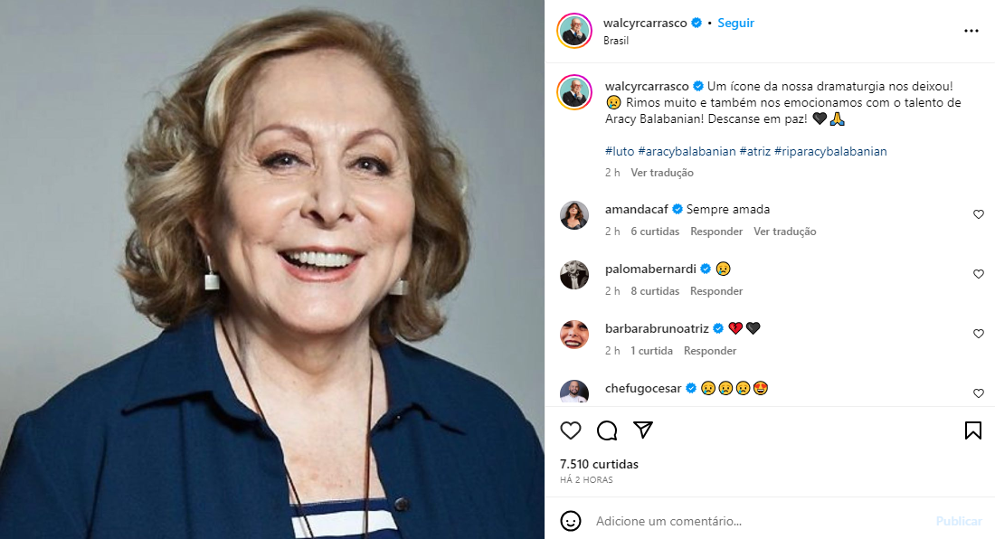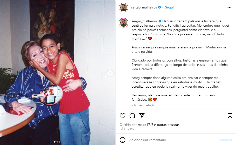 “Não sei dizer em palavras a tristeza que senti ao ler essa notícia. Foi difícil acreditar. Me lembro que liguei pra ela há poucas semanas, perguntei como ela tava, e a resposta foi: “Tô ótima. Não liga pra essas fofocas, não. É tudo mentira?” Aracy vai ser pra sempre uma referência pra mim. Minha avó na arte e na vida. Obrigado por todos os conselhos, histórias e ensinamentos que fizeram toda a diferença ao longo de todos esses anos da minha vida e carreira. Aracy sempre tinha alguma coisa pra ensinar e sempre me incentivava (e cobrava) que eu estudasse muito? Ela me fez acreditar que eu poderia realmente viver do meu trabalho. Perdemos, além de uma artista gigante, um ser humano fantástico.