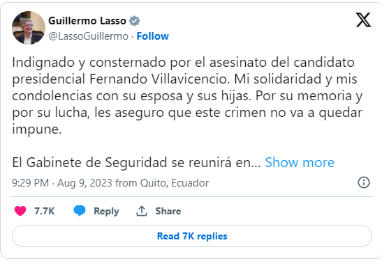“Indignado e chocado com o assassinato do candidato presidencial Fernando Villavicencio. Minha solidariedade e condolências à esposa e filhas. Pela sua memória e pela sua luta, garanto-vos que este crime não ficará impune”, comentou o atual presidente do Equador Guillermo Lasso, em seu perfil em uma rede social.