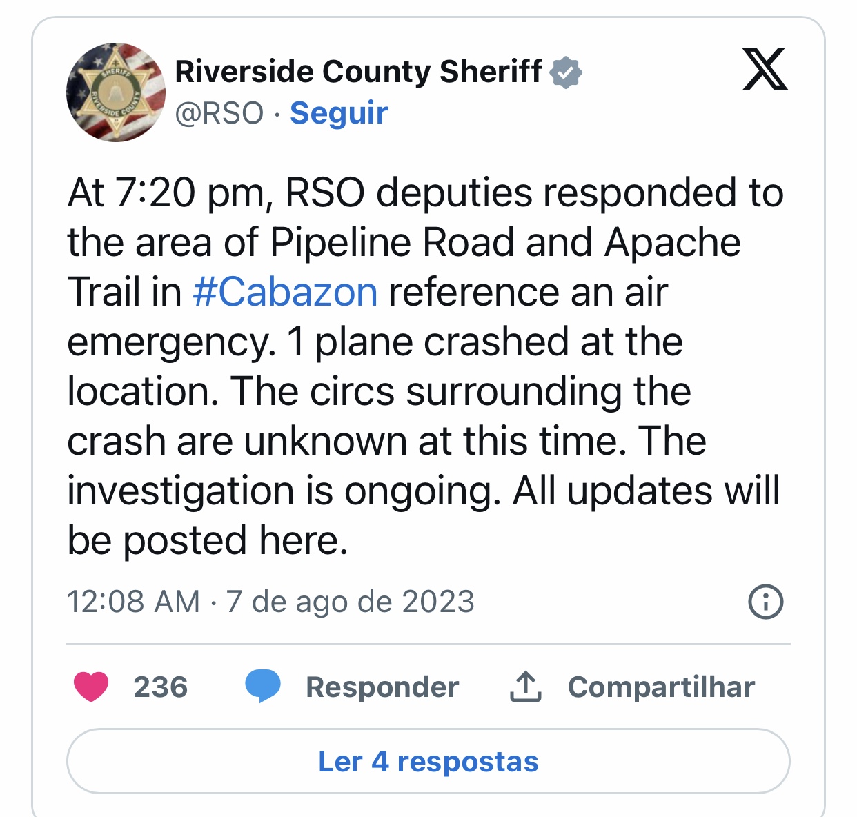 O alerta sobre o acidente foi emitido por volta das 19h20, horário local, enquanto as equipes de resposta de emergência estavam combatendo um incêndio próximo à cidade de Cabazon, conforme comunicado pela autoridade policial do condado de Riverside no Twitter.