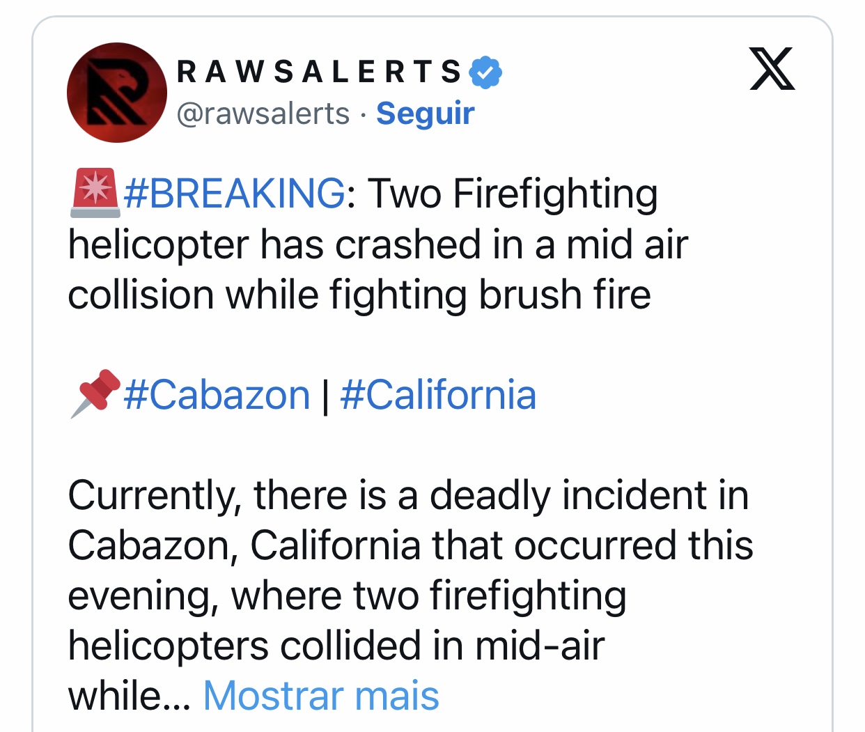Um helicóptero pertencente aos bombeiros dos Estados Unidos sofreu um acidente no domingo no sul da Califórnia, enquanto estava envolvido no combate a um incêndio no condado de Riverside, conforme relatado pelas autoridades à Associated Press.