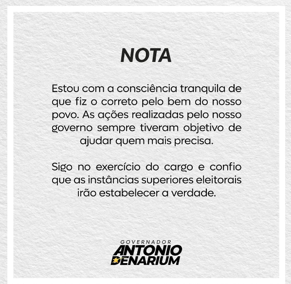 Em nota, Denarium disse que está com “a consciência tranquila de que fiz o correto pelo bem do nosso povo. As ações realizadas pelo nosso governo sempre tiveram objetivo de ajudar quem mais precisa”.