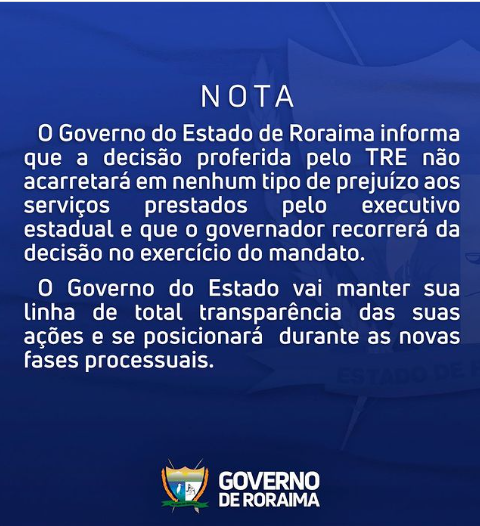 O governo de Roraima publicou que a decisão proferida pelo TRE não acarretará nenhum tipo de prejuízo aos serviços prestados pelo executivo estadual.