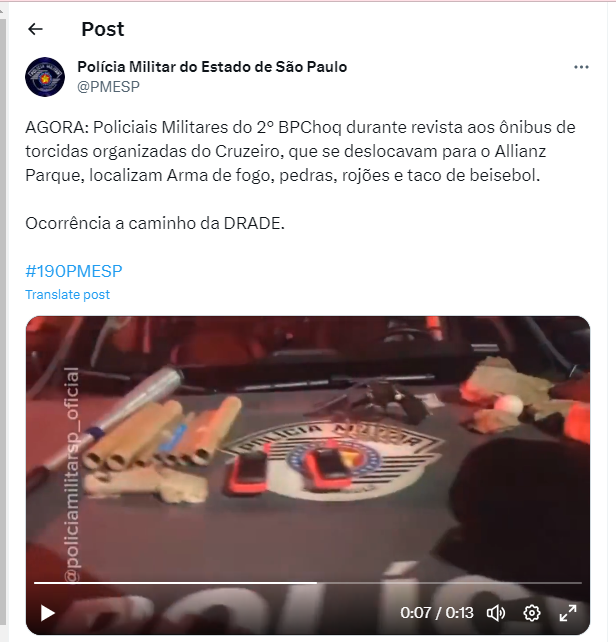 Na última segunda-feira (14) seis torcedores foram encaminhados a delegacia após serem apreendidos com revólver, rojões, pedras, soco-inglês e taco de beisebol antes da partida entre Cruzeiro e Palmeiras, no Allianz Parque, zona oeste de São Paulo.