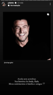 “Eu não acredito. Descanse em paz, Rafa”, disse a cantora Gabi Martins. O influencer Pyong Lee lamentou: “Não acredito? Rafa? descanse em paz e que Deus conforte todos os familiares e amigos. Estou em choque com a notícia.”