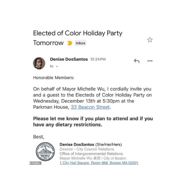 A controvérsia teve início quando a diretora de relações municipais, Denise DosSantos, enviou erroneamente um convite para todos os 13 vereadores, incluindo sete membros brancos, para uma “Festa de Natal dos Eleitos de Cor” na histórica Parkman House, propriedade municipal.