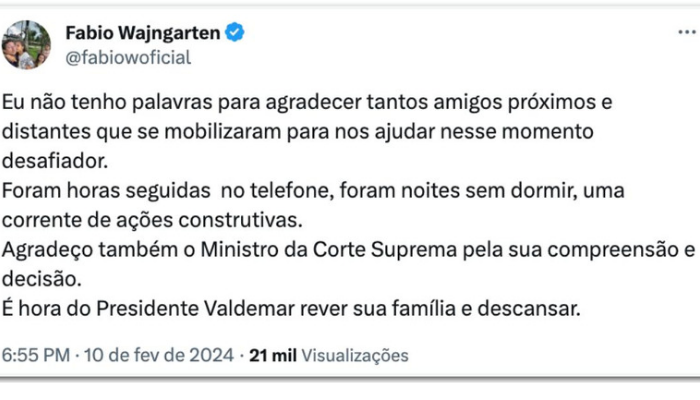 “Eu não tenho palavras para agradecer tantos amigos próximos e distantes que se mobilizaram para nos ajudar nesse momento desafiador. Foram horas seguidas no telefone, foram noites sem dormir, uma corrente de ações construtivas. Agradeço também o Ministro da Corte Suprema pela sua compreensão e decisão“, afirmou.