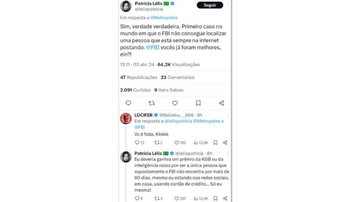 A jornalista brasileira Patrícia Lélis, que está foragida nos Estados Unidos, causou polêmica ao debochar do FBI (Federal Bureau of Investigation), a polícia federal norte-americana. Após ser revelado que ela é procurada pelo FBI há mais de 80 dias por acusações de fraude, Lélis não se conteve e ironizou a instituição em uma publicação no antigo Twitter.