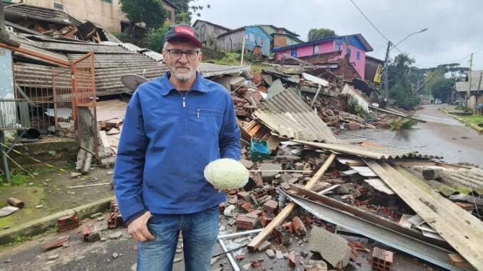 18 de maio de 2024 - Paulo César da Silva em frente à sua casa na rua Guilherme Dal Ri, em Gramado (RS) Foto: Marcelo Ferraz