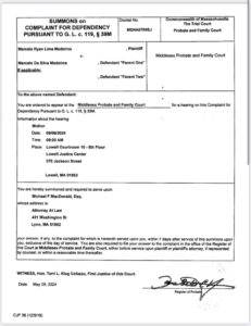 CONVOCAÇÃO ativada QUEIXA DE DEPENDÊNCIA DE ACORDO COM G. L. c. 119, § 39M Nº do documento MI24A0769SJ Comunidade de Massachusetts O Tribunal de Primeira Instância Tribunal de Sucessões e Família Marcelo Ryan Lima Medeiros , Requerente Tribunal de Família e Sucessões de Middlesex Marcelo Da Silva Medeiros LEaplicável: , Réu “Pai Um” , Réu “Pais Dois* Ao réu acima mencionado: Você está condenado a comparecer ao Tribunal de Família e Sucessões de Middlesex Dependência de acordo com G. L. c. 119, § 39M. informações sobre a audiência: Movimento Data: 06/06/2024 Horário: 09h00 Local: Lowell Courtroom 10 – 5º andar Centro de Justiça Lowell Rua Jackson, 370 para uma audiência sobre esta reclamação para Lowell, MA 01852 Você está convocado e obrigado a servir: Michael F MacDonald, esq. cujo endereço é: Advogado 431 Washington Street Lynn, MA 01902 sua resposta, se houver, à reclamação para a qual lhe é entregue, no prazo de 7 dias após o envio desta intimação a você, excluindo o dia do serviço. Você também deve apresentar sua resposta à reclamação no cartório do Registro deste Tribunal no Tribunal de Família e Sucessões de Middlesex, antes da notificação ao demandante ou ao advogado do demandante, se representado por um advogado, ou dentro de um prazo razoável a partir de então. TESTEMUNHA, Exmo. Terri L. Klug Cafazzo, Primeira Ministra deste Tribunal. Data: 29 de maio de 2024 Cadastro de Prob.