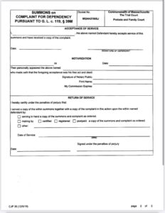 CONVOCAÇÃO ativada QUEIXA DE DEPENDÊNCIA DE ACORDO COM G. L. c. 119, § 39M Nº do documento MI24A0769SJ Comunidade de Massachusetts O Tribunal de Primeira Instância Tribunal de Sucessões e Família ACEITAÇÃO DO SERVIÇO . o Réu acima mencionado aceita a notificação deste intimação e recebeu cópia da reclamação. Data: ASSINATURA DO RÉU NOTARIZAÇÃO SS Então apareceu pessoalmente o acima mencionado que jurou que a aceitação anterior foi seu ato e ação livre. Assinatura do Tabelião Público: Nome impresso: A minha comissão expira: Data: RETORNO DE SERVIÇO Certifico, sob pena de perjúrio, que: Entreguei uma cópia da intimação juntamente com uma cópia da reclamação nesta ação ao réu nomeado por: [entregando em mãos cópia da intimação e reclamação conforme ordenado. • envio por correio • cópia autenticada • registrada e pós-paga da intimação e reclamação conforme solicitado. outro. Data de serviço: datas Assinado sob pena de perjúrio Data: CJP 36 (05/12/19) página 2 de 3.