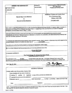 PEDIDO DE SERVIÇO POR Nº do documento MI24A0769SJ 8 PUBLICAÇÃO [ ENVIANDO Comunidade de Massachusetts O Tribunal de Primeira Instância Tribunal de Sucessões e Família Marcelo Ryan Lima Medeiros VS. Marcelo Da Silva Medeiros Tribunal de Família e Sucessões de Middlesex Modo de comércio 10-U Wobum, MA 01801 (781)865-4000 Mediante solicitação do(s) autor(es)/peticionários) para uma ordem direcionando os réus/réus(es). comparecer, pleitear ou responder, de acordo com Mass.R.Civ.P./Mass.R.Dom.Rel.P.Rule 4, parecendo ao tribunal que esta é uma ação para Status Juvenil de Imigrante Especial ajuizada em 17 de maio de 2024. O(s) réu(s)/Requerido(s) não pode(m) ser encontrado(s) na Commonwealth e o paradeiro presente(s) do(s) réu(s)/réu(s) é desconhecido. A citação pessoal do réu não é, portanto, praticável, e o(s) réu(s)/réus) compareceram/não compareceram voluntariamente nesta ação. É ordenado que o(s) réu(s)/réus) seja(ão) instruído(s) a comparecer, pleitear, responder ou de outra forma agir em relação à reclamação/petição aqui contida ou antes do dia de retorno de 6 de junho de 2024 Se não o fizer, este Tribunal procederá a uma audiência e julgamento desta questão. Fica ainda ordenado que a convocação anexa seja publicada uma vez no Gnews EUA-Brasil nome do jornal) um jornal publicado em: Rua Forte Orange 131 Jd Ipora São Paulo Brasil incluir endereço postal do jornal) a publicação a ser 14 dias pelo menos antes do referido dia de retorno. Ordena-se ainda que uma cópia do a intimação será enviada ao(s) réu(s)/réus) em seu último endereço conhecido por carta registrada ou certificada. Data 29 de maio de 2024 JUSTIÇA DE SUCESSO E TRIBUNAL DE FAMÍLIA RETORNO DE SERVIÇO Certifico, sob pena de perjúrio, que: Cumpri a ordem de notificação por: [ enviando O certificado O registrou cópia da intimação conforme solicitado e, [ fazendo com que a intimação fosse publicada em Publicação foi em que foi pelo menos O dias O meses) antes do referido dia de retorno Data: Assinatura: NOTA: O comprovante de serviço deve ser feito em conformidade com Mass.R.Civ.P./Mass.R.Dom.Rel.P.Rule 4 e pode ser feito neste formulário. Este formulário NÃO pode ser utilizado para ações de divórcio ou pensão alimentícia separada.