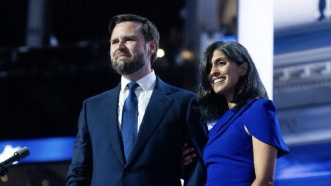 Usha Chilukuri Vance apresentou-se como uma figura inesperada no palco da convenção republicana, onde seu marido, J.D. Vance, havia sido anunciado como candidato a vice-presidente na chapa de Donald Trump. Em meio a um ambiente repleto de cartazes clamando por “deportação em massa já”, a filha de imigrantes indianos compartilhou como seu marido adotou sua dieta vegetariana e até aprendeu a cozinhar para sua mãe. Com seus cabelos brancos à mostra e mínima maquiagem — em contraste com os saltos altos e maquiagem ostentosa das outras presentes — Usha, de 38 anos, não mencionou Trump em nenhum momento.
