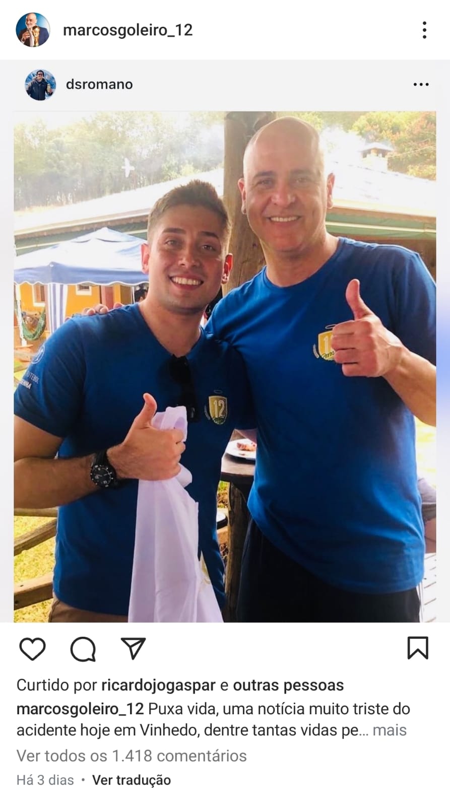 Marcos, ídolo alviverde, compareceu ao velório de Danilo Romano, piloto falecido no acidente aéreo em Vinhedo, e expressou seu pesar nas redes sociais.