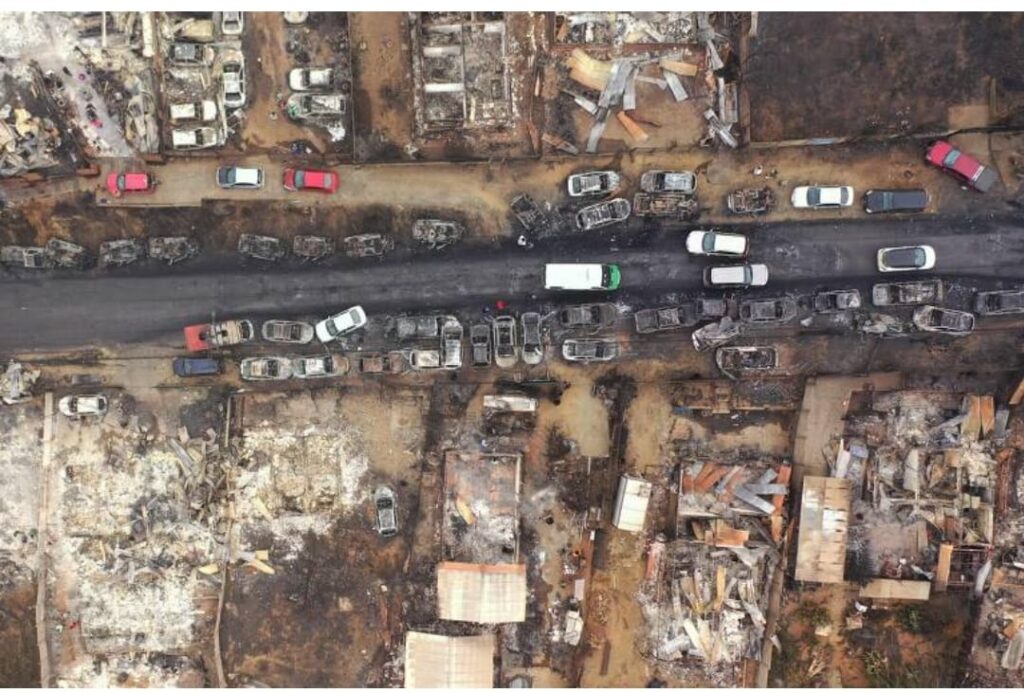 Vista aerea de casas e carros queimados após incendio criminoso florestal no Chile. Foto: Rodrigo Arangua.