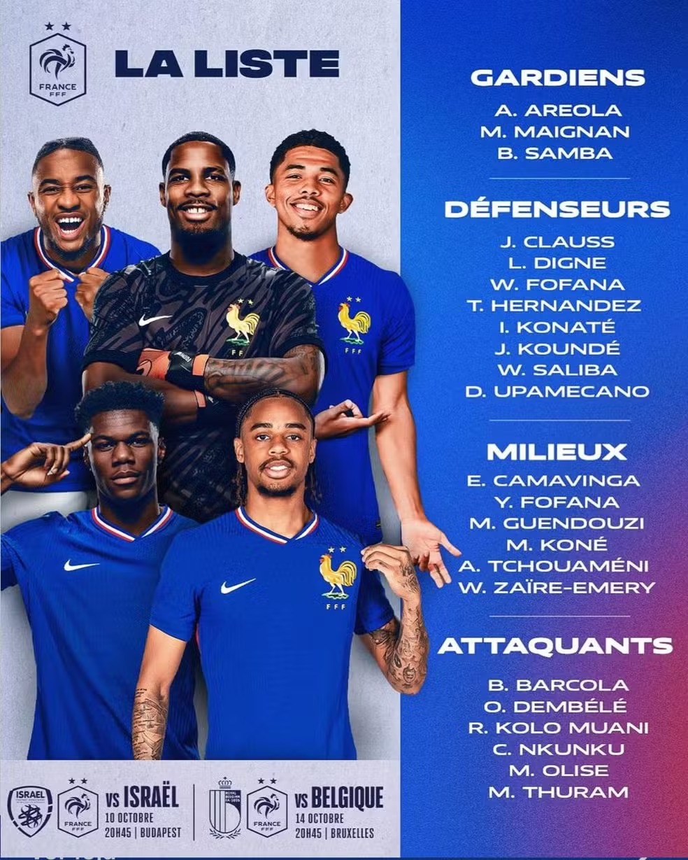 A França divulgou a lista de convocados para os confrontos contra Israel e Bélgica, programados para esta quinta-feira(3). A grande novidade é a ausência de Kylian Mbappé, que retornou de uma lesão durante a partida do Real Madrid na segunda rodada da Champions League, mas sentiu um desconforto muscular logo após o jogo. Em sua ausência, Christopher Nkunku, atacante do Chelsea, ganhou uma nova oportunidade na seleção.