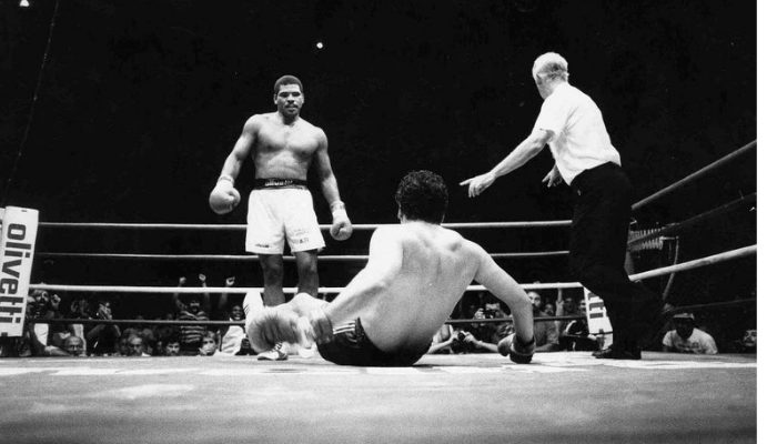Maguila e o nocauteado Felipe “Pantera” Rodrigues, em luta realizada no ginásio do Ibirapuera, em 1987. Foto:Vidal Cavalcante.
