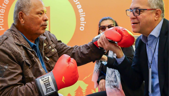 Maguila ao lado do neurologista Renato Anghinah; ele sofria de demência pugilística e fazia tratamento com canabidiol. Foto: Eric Saldanha Delacoleta / Divulgação.