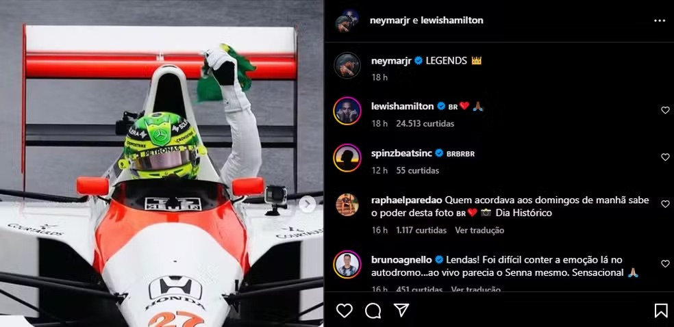 Neymar celebra homenagem de Lewis Hamilton a Ayrton Senna: “Lendas”. Foto: Reprodução/redes sociais.