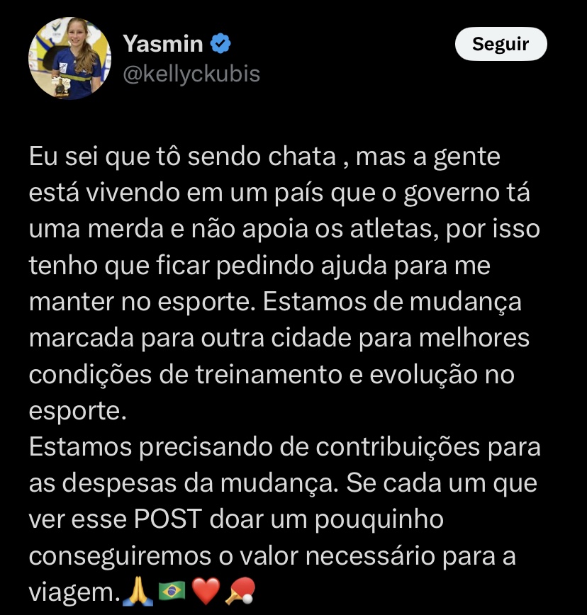 Em uma publicação no Twitter/X, Yasmin denunciou a ausência de políticas públicas efetivas para atletas como ela: