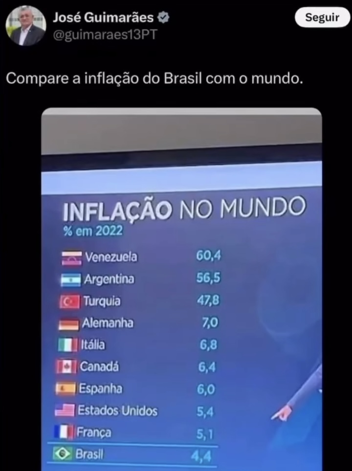 A publicação, que comparava a inflação brasileira com a de outros países, gerou repercussão imediata nas redes sociais. Isso porque o cenário atual, sob a gestão de Lula, é bem diferente: as projeções do Banco Central indicam que a inflação de 2024 encerrará em 4,9%, um número acima do teto da meta de 4,5%. Diante das críticas, Guimarães apagou o post na manhã de segunda-feira, 30.