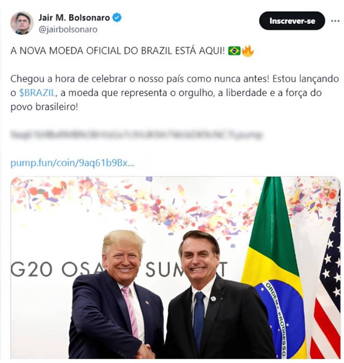 Filho do ex-presidente alerta seguidores sobre golpe envolvendo falsa criptomoeda publicada no perfil de Bolsonaro.