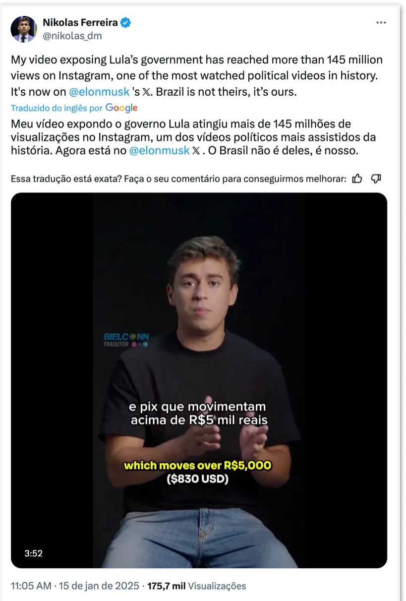 Em uma estratégia para amplificar sua mensagem, Nikolas compartilhou uma versão legendada do vídeo em inglês, marcando Elon Musk, dono do X, na publicação. “Meu vídeo expondo o governo Lula atingiu mais de 145 milhões de visualizações no Instagram, um dos vídeos políticos mais assistidos da história. Agora está no @elonmusk 𝕏. O Brasil não é deles, é nosso”, escreveu.