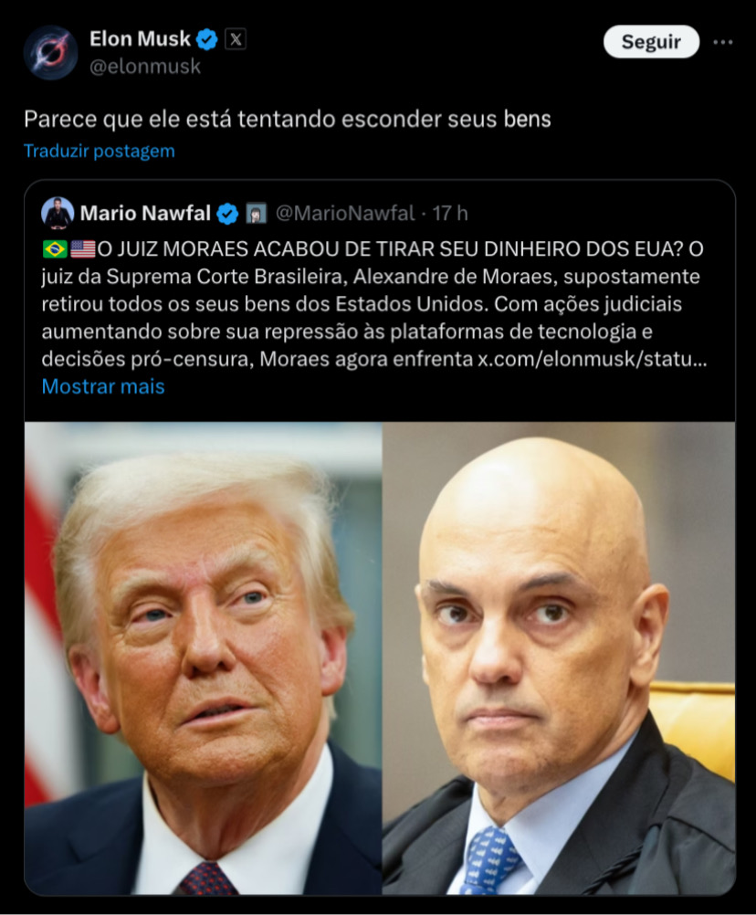 O empresário Elon Musk revelou uma possível movimentação suspeita do ministro Alexandre de Moraes, do Supremo Tribunal Federal (STF), sugerindo que ele estaria tentando ocultar seu patrimônio das autoridades americanas. “Parece estar tentando esconder seus bens”, afirmou Musk em uma publicação no X.