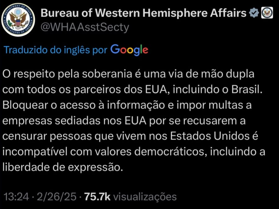 A nota oficial do governo americano afirmou que “o respeito pela soberania é uma via de mão dupla com todos os parceiros dos EUA, incluindo o Brasil”. O comunicado também criticou diretamente a imposição de multas às plataformas digitais, dizendo que “bloquear o acesso à informação e impor multas a empresas sediadas nos EUA por se recusarem a censurar pessoas que vivem nos Estados Unidos é incompatível com os valores democráticos, incluindo a liberdade de expressão”.