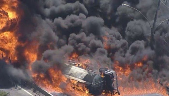 A colisão aconteceu antes das 13h, quando a carroceria do caminhão tombou, bloqueando a pista. O incêndio gerou uma intensa fumaça preta, que se espalhou rapidamente pela região.
