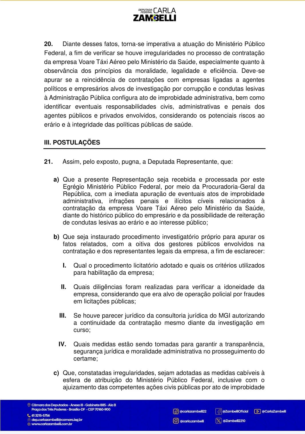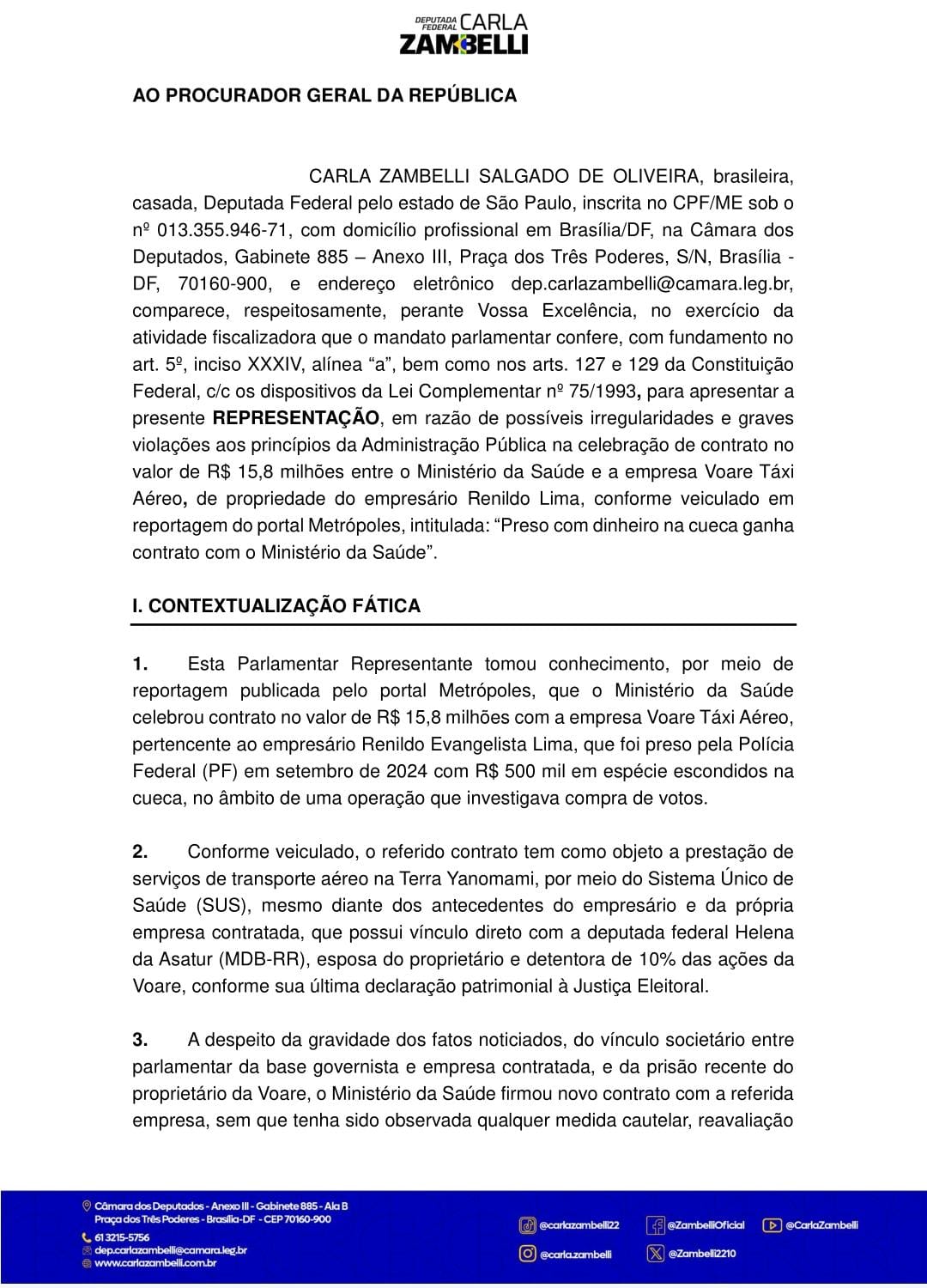 A deputada federal Carla Zambelli protocolou uma representação junto ao Tribunal de Contas da União (TCU) e à Procuradoria-Geral da República (PGR) contra um contrato firmado entre o Ministério da Saúde e a empresa Voare Táxi Aéreo, no valor de R$ 15,8 milhões. O objeto do acordo é o transporte aéreo na região Yanomami por meio do SUS, mas Zambelli aponta fortes indícios de irregularidades.