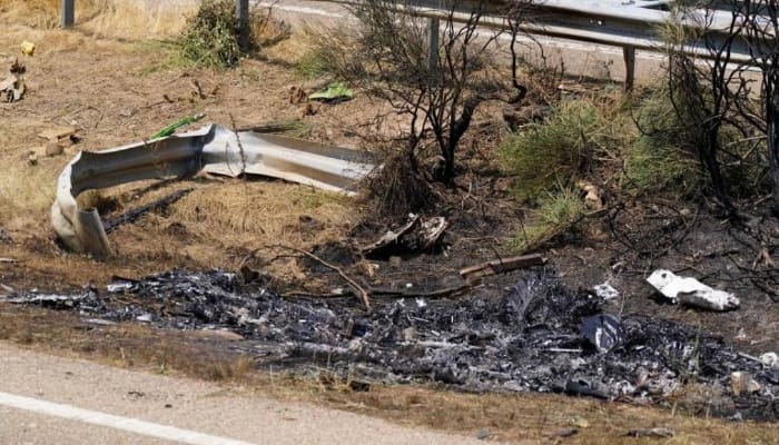 Destroços do veiculo onde estavam os jogadores de Portugal Diego Jota e seu irmão Andre Felipe, em rodovia na provincia de Zamora, na Espanha; autoridades dizem que pneu de Lamborgihini estourou durante ultrapssagem. Foto: Cesar Manso.
