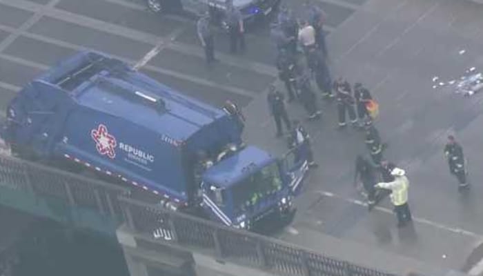 Após a colisão em frente ao cassino, o suspeito abandonou o veículo e fugiu a pé até o cruzamento da Broadway com a Mystic Street, onde sequestrou um caminhão de lixo pertencente à empresa Republic Services.