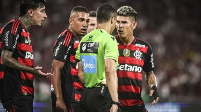 A torcida rubro-negra pediu a marcação, mas o árbitro não assinalou nada e o VAR também não interveio. O comentarista de arbitragem PC Oliveira considerou o lance normal.