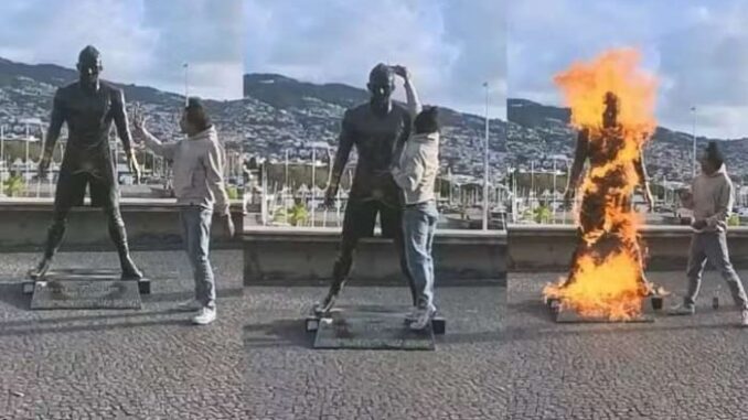 Um homem ateou fogo à estátua de Cristiano Ronaldo localizada em frente ao Museu CR7, em Funchal, na ilha da Madeira, na última terça-feira (20). O suspeito gravou a ação e divulgou as imagens nas redes sociais. Segundo a Polícia de Segurança Pública (PSP) da Madeira, ele foi rapidamente interceptado e encaminhado para atendimento psiquiátrico.