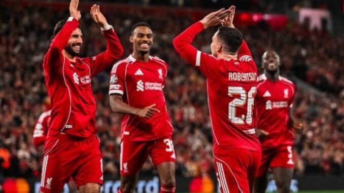 Com gols de Szoboszlai, Salah, Gravenberch e Ekitiké, time inglês domina Anfield e reencontra PSG na próxima fase