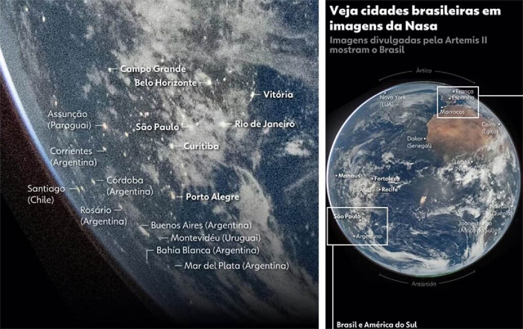Imagens divulgadas pela NASA durante a missão Artemis II chamaram atenção ao mostrar a Terra vista a grande distância, permitindo identificar, ainda que de forma indireta, regiões do Brasil através de seus padrões de iluminação noturna.