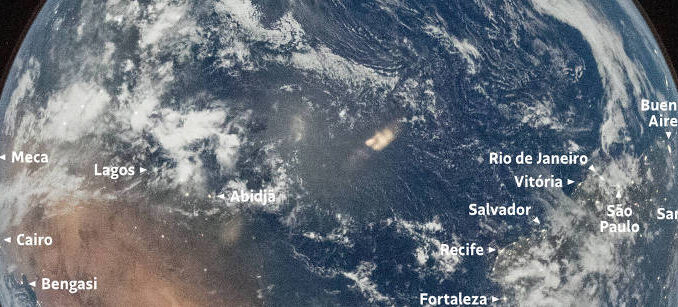 Registros da missão Artemis II revelam o Brasil visto do espaço, com áreas urbanas destacadas por pontos de luz entre nuvens e oceanos