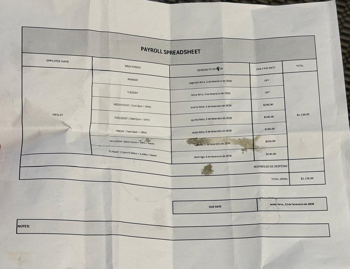 Também foi relatada a ausência de descontos básicos que normalmente aparecem no contracheque de funcionários registrados nos Estados Unidos, como “Federal Income Tax”, “Social Security” e “Medicare”, o que levanta ainda mais questionamentos sobre a forma de contratação.
