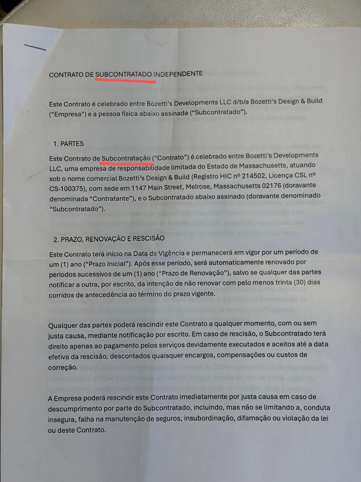 Segundo os relatos, esses documentos os enquadravam como subcontratados. O contrato previa obrigações típicas desse modelo, como a atuação independente e a responsabilidade dos próprios trabalhadores por impostos, custos e encargos.